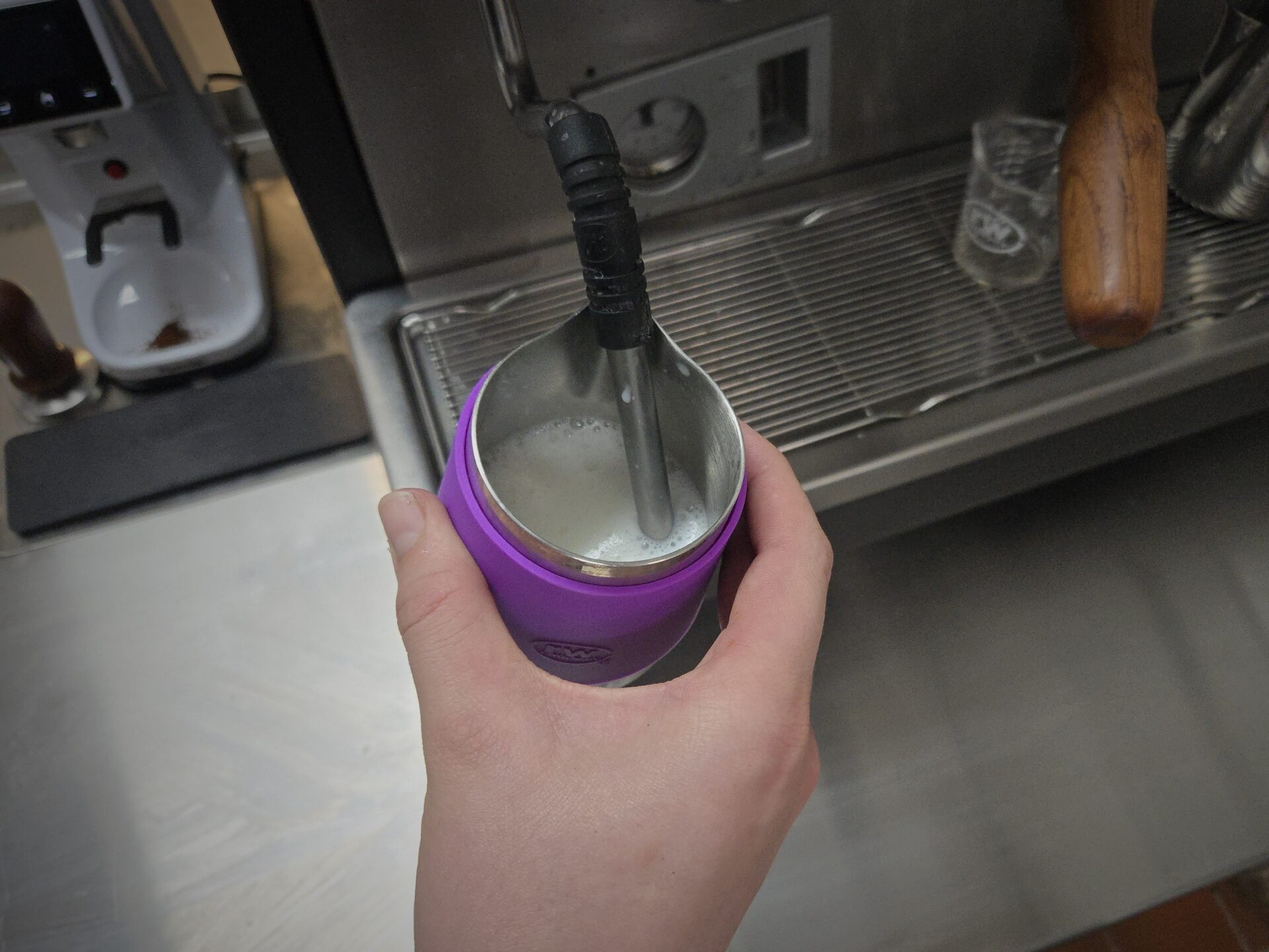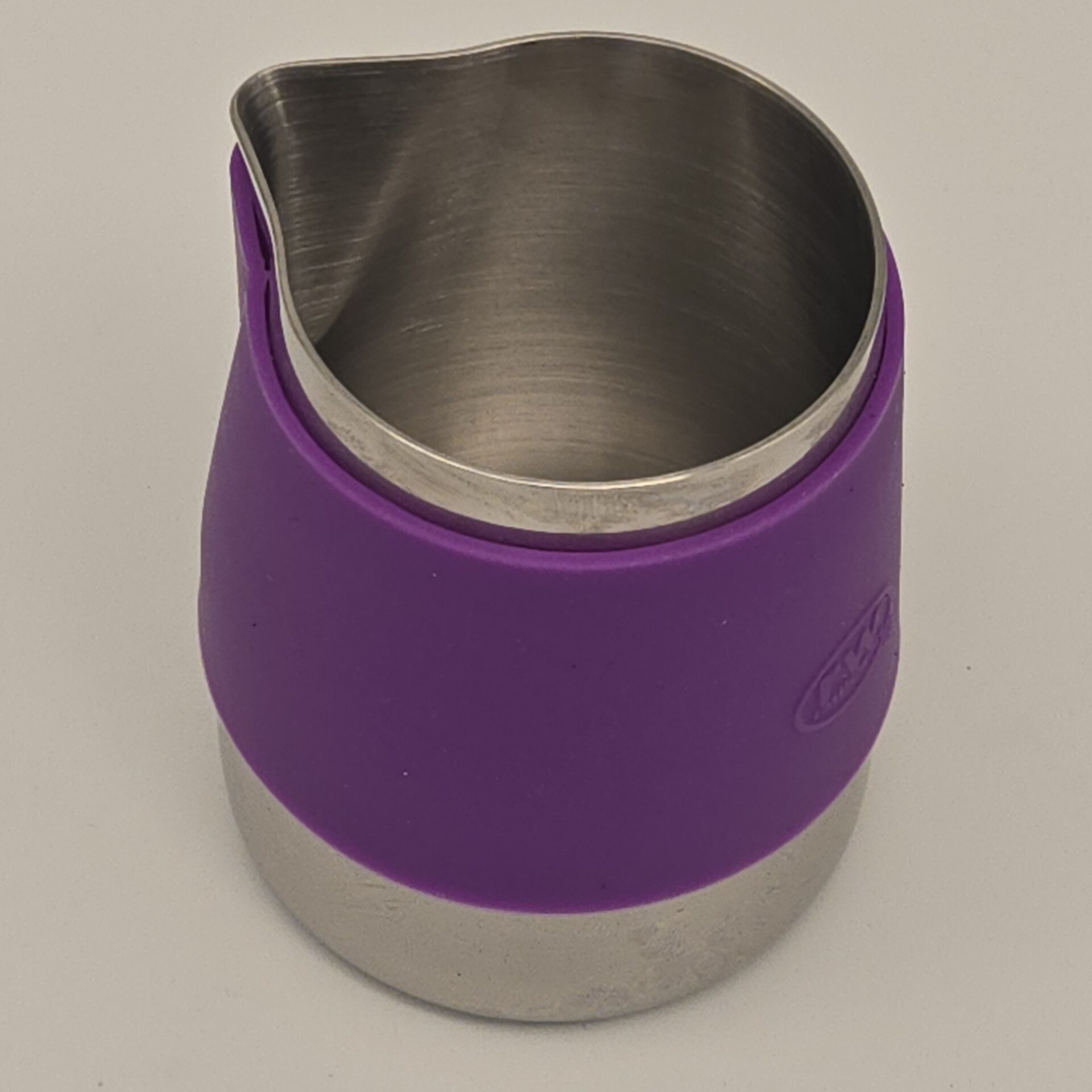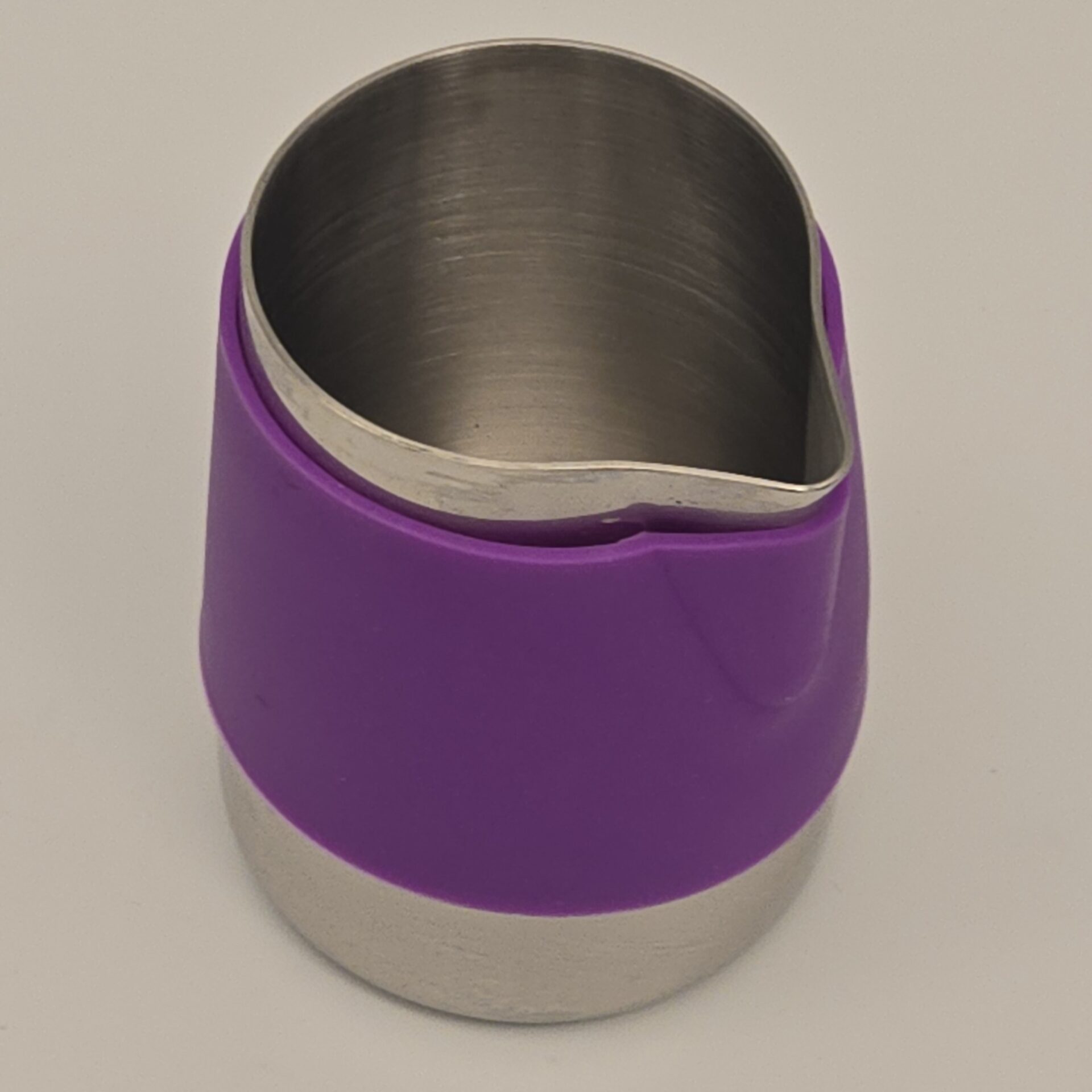 This 12 oz handle-free macchiato pitcher from rattleware is designed for baristas who demand style, comfort, and performance. The soft-touch purple rubber sleeve enhances grip and protects fingers from heat during milk steaming, while the robust stainless steel core ensures long-lasting use. Its compact size and precision spout make it perfect for smaller drinks like cortados and macchiatos, offering excellent control in high-volume settings.