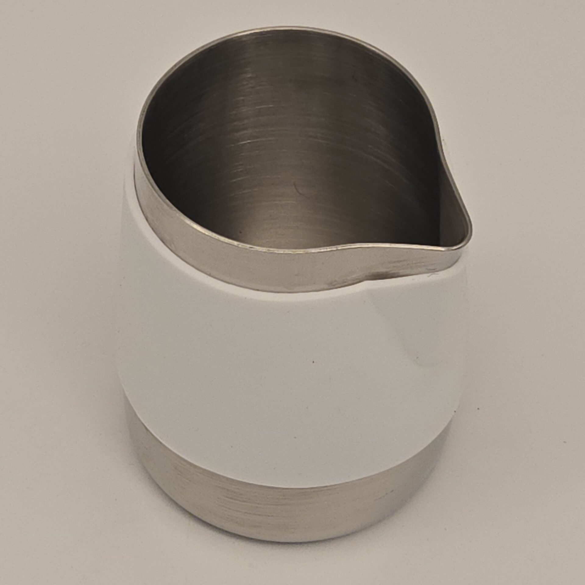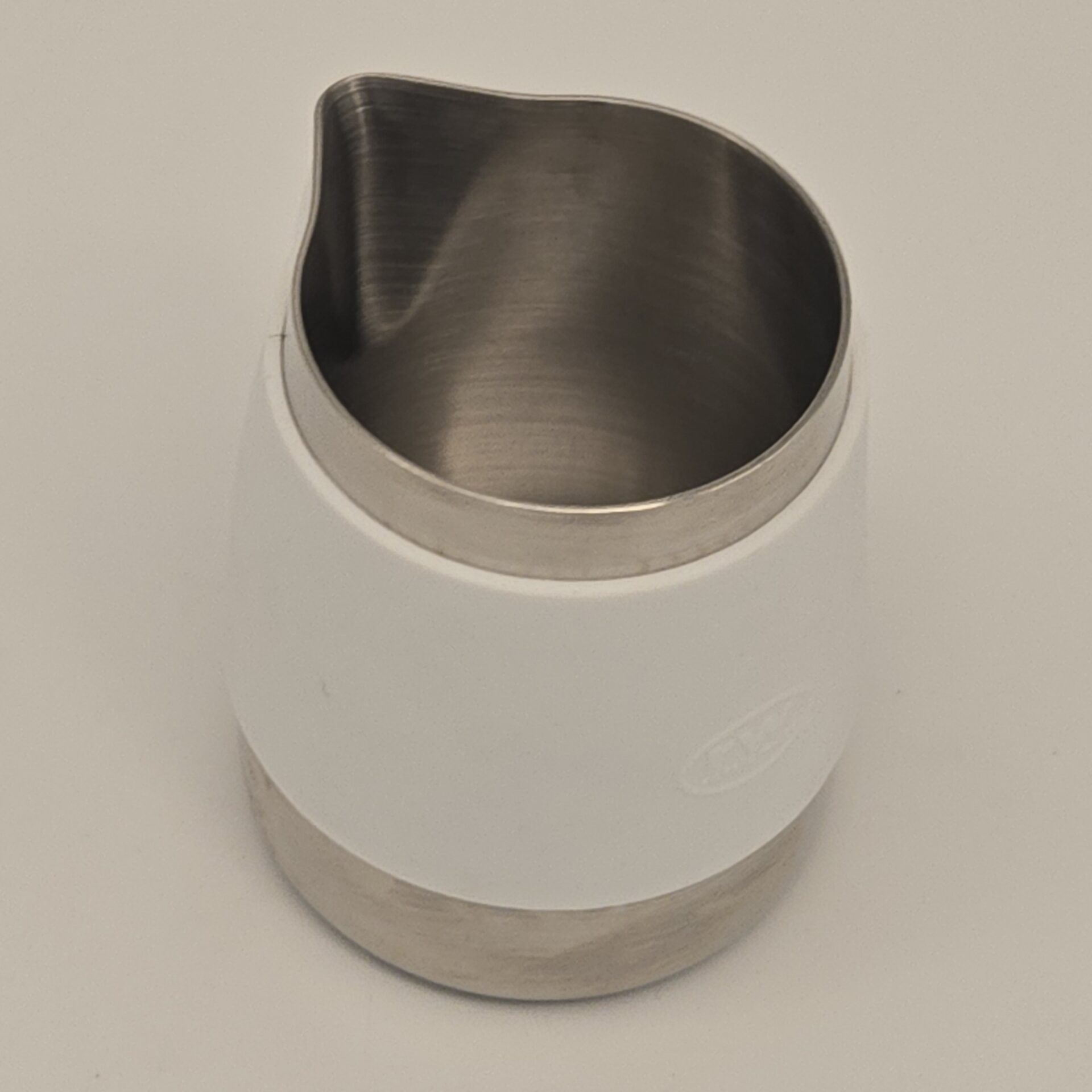 12 oz Macchiato Pitcher, Handle Free, Stainless Steel, with White Rubber Shell