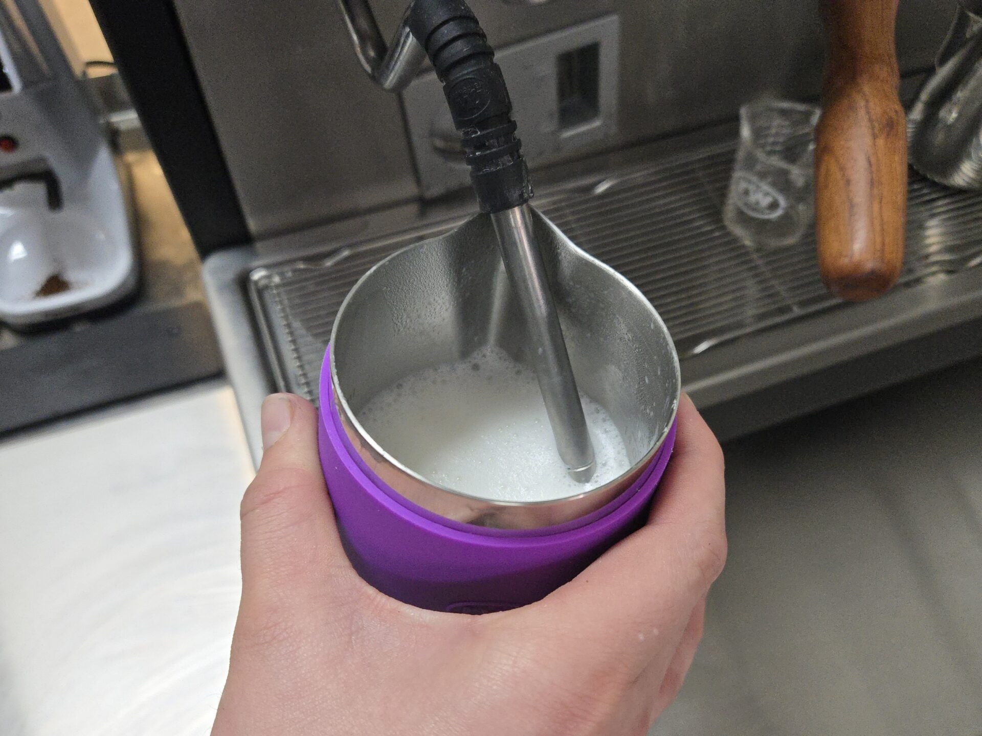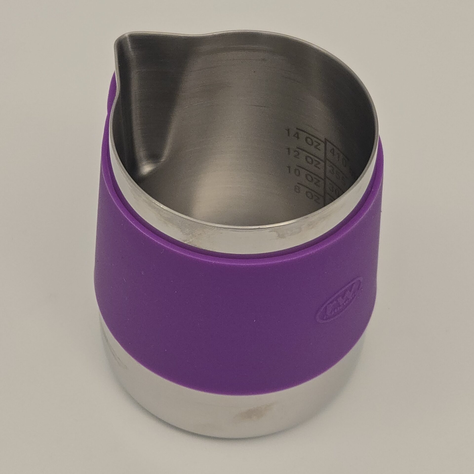 This 20 oz latte art pitcher from rattleware combines style and performance with its heat-resistant purple silicone sleeve and thoughtfully engineered stainless steel body. Designed without a handle for greater control and a natural feel, it allows baristas to pour milk with precision and ease. The integrated volume markings inside the pitcher support accuracy during high-paced service, making this a staple tool for any cafe focused on quality and consistency.