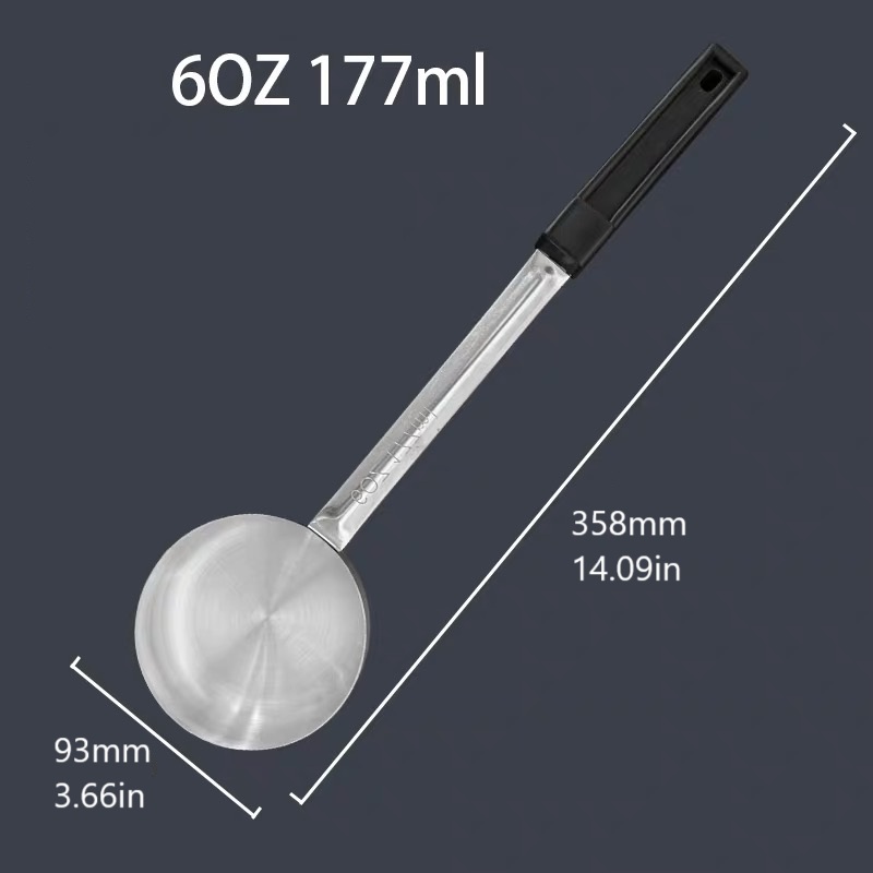 The rattleware 6oz serving ladle features a durable stainless steel bowl and a comfortable heat-resistant black handle. Designed for serving soups, sauces, and stews, this ladle is perfect for both professional and home kitchens.