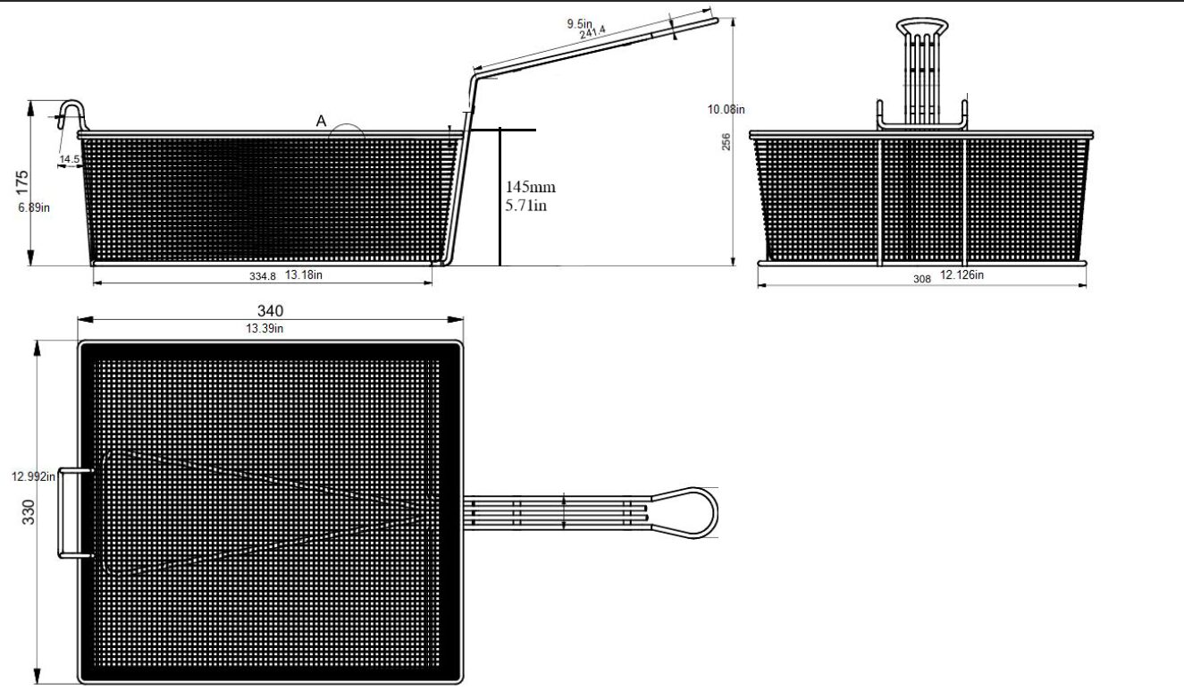 Durable stainless steel fryer basket 13.4″ x 13″ x 6.9″ perfect for heavy use in professional kitchens. Its generous size allows for frying large batches of food uniformly.