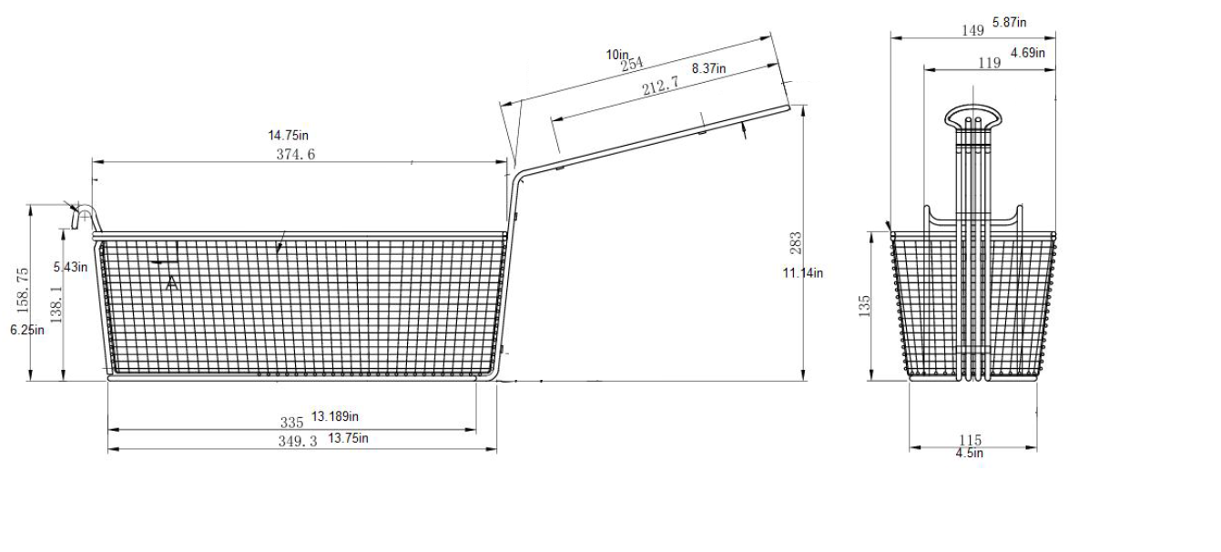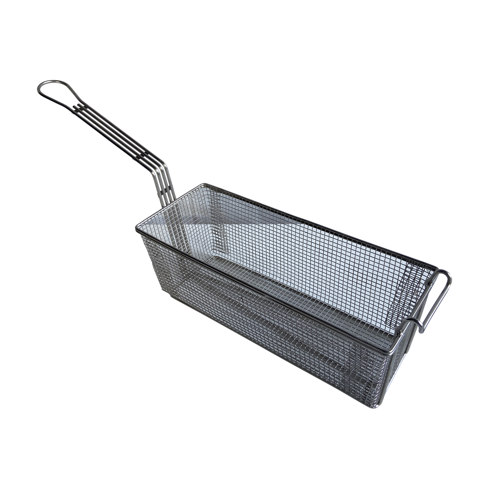 High-quality, narrow stainless steel fryer basket 14.75″ x 5.9″ x 6.25″, designed to hold ample amounts of food with efficient space usage. Suitable for various deep frying applications.